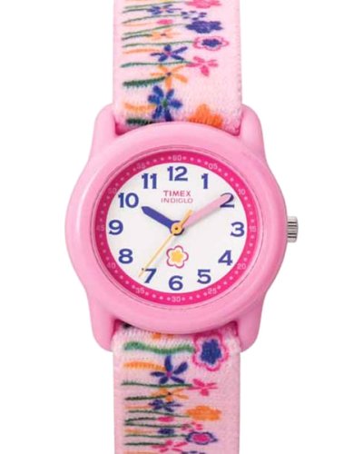 A Timex Youth Time Teacher wristwatch It has a white dial with large purple numbers and colour coordinated hour handminute hand The case is made of pink resin and there is also a fabric band with a flower design This piece has a new indigo nightlight It comes with its own Timex one year guarantee