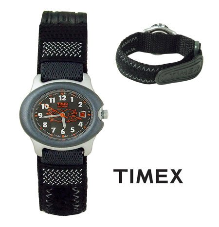 (TIMEX)Kids Analogue Watch (T71291)A black face decorated with orange graphics, orange and silver hands, silver numerals, silver and a grey/black coloured bezel. This watch has a strong Fast Wrap velcro strap in black with the Timex logo on the fold over fastener.This watch comes very well presented in a TIMEX presentation box.Features:- Teen watch age 6+.- Unique dial pattern.- Indiglo night light, The Indiglo night light uniformly lights up the surface of the watch dial using patented electroluminescent lighting technology.- Fast Wrap velcro strap.- Water resistant to 30 metres. Water resistance is measured and rated by depth in meters, tests are made by subjecting the watch to water pressure. The watch will withstand water pressure up to their respective ratings as long as the lens or crystal, crown or push buttons, and case remain intact. Even though the watch may be water resistant to a significant depth, it is not a diver watch and should not be used for diving. Timex strongly recommends rinsing your watch with fresh water asfter exposure to salt water.- Lug length 16mm.- Resin case material.- Case size approximately 29mm.- Manufacturers Warranty: Return under warranty to be processed directly with Timex.
