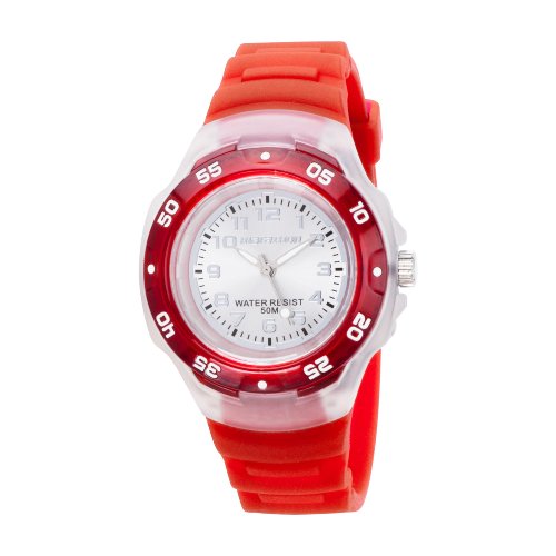 Timex Kids Watch with Jelly Strap and Analogue Movement. Product Description : - Quartz Analogue Movement - Stainless steel case - Red jelly strap - Silver dial - Water resistant to 50 metres - Turning ring - Luminescent hands Also Comes With : - 1 Year Manufacturer's Guarantee - Presentation Watch Box