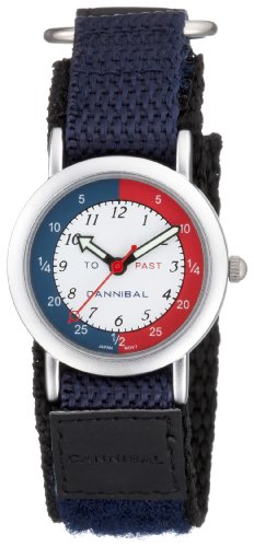 A stylish adventure analogue watch by Cannibal This watch has a white dial with black anaolgue numbers around the dial around the edge of the dial there is japan movement which is red and blue this is ideal for a child starting to learn the time leading onto a navy blue velcro adjustable fabric strap it is also up to meters water resistance this stylish adventure watch comes with a full Cannibal year guarantee