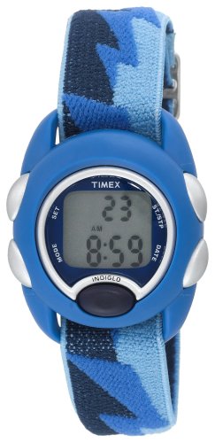 The Timex T70981 Youth digital watch is reliable, durable, and readable in the dark, thanks to the integrated Indiglo night-light, but it's also flat-out fun to wear. It features an easily readable digital display with large, recognizable icons for the chrono, alarm, and timer functions, and a comfortable elastic fabric strap (for better dirt and stain resistance) with blue lightning bolts against a multi-tone blue base. This watch also offers water resistance to 30 meters (100 feet), 12/24-hour time, durable blue resin case, large function buttons, and Timex's unique Kids Loss Protection Plan. It's recommended for children ages 6 and older. The Indiglo night-light uniformly lights the surface of the watch dial using patented blue electroluminescent lighting technology. It uses less battery power than most other watch illumination systems, enabling your watch battery to last longer. The Night Mode feature allows you to illuminate the Indiglo night-light for 3 seconds with any button press, regardless of the mode or function.