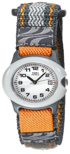 Nicely sporty and stylish to boot, the Timex T78351 Tween quartz analog watch is a great match for your constantly on-the-go youngster. It features a wide, oval-shaped resin watch case in silver and gray that frames a classic white dial background with full Arabic numeral display, black hands (with seconds hand), and small minute indexes. It also offers water resistance to 30 meters (100 feet), date display at 3 o'clock, and a durable nylon Fast Wrap strap (with Velcro fastener) in orange, gray, and silver. The Indiglo night-light uniformly lights the surface of the watch dial using patented blue electroluminescent lighting technology. It uses less battery power than most other watch illumination systems, enabling your watch battery to last longer.