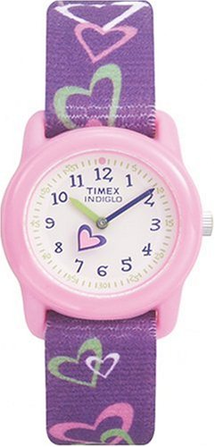 The Timex Kids Rotating Disc watch (model 7B111) is reliable, durable, and readable in the dark, thanks to the integrated pink Indiglo night-light. But it's also flat-out fun to wear. It has a durable pink resin case framing a white dial, which is complemented by a full Arabic numeral display in purple and different colored hour and minute hands (green and purple respectively). It also has a small heart that rotates around the dial with the hands, and a comfortable purple elastic fabric strap (for better dirt and stain resistance) with a heart pattern. This watch also offers water resistance to 30 meters (100 feet) and Timex's unique Kids Loss Protection Plan. It's recommended for children ages 6 and older.